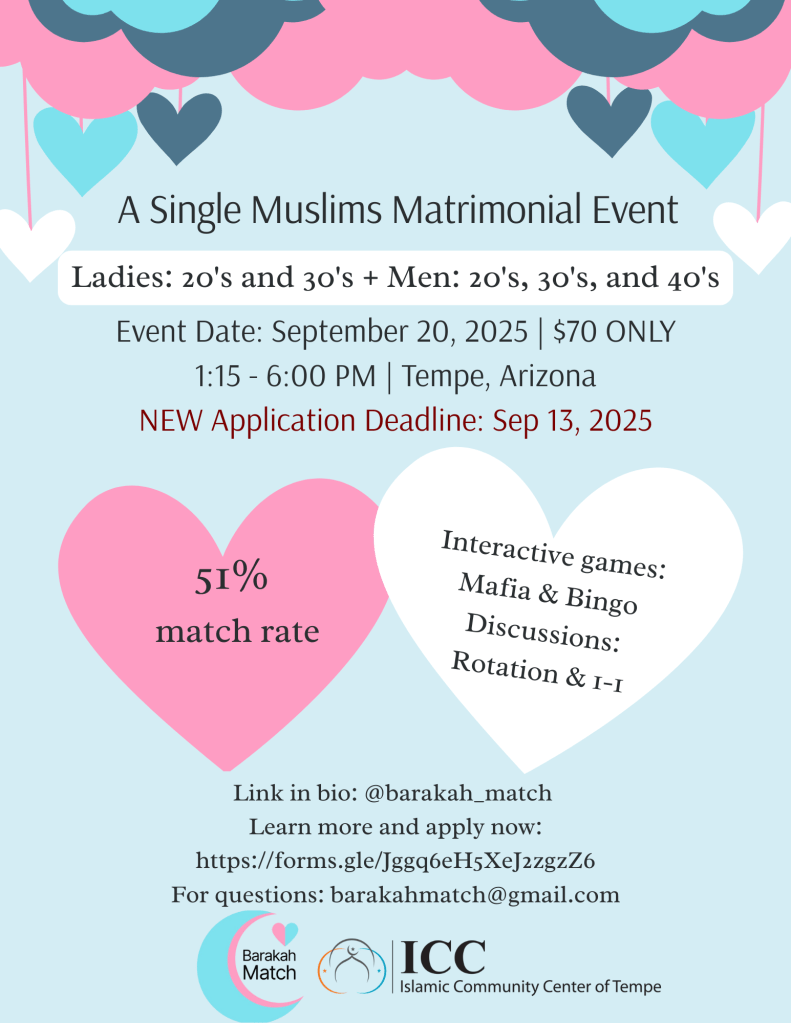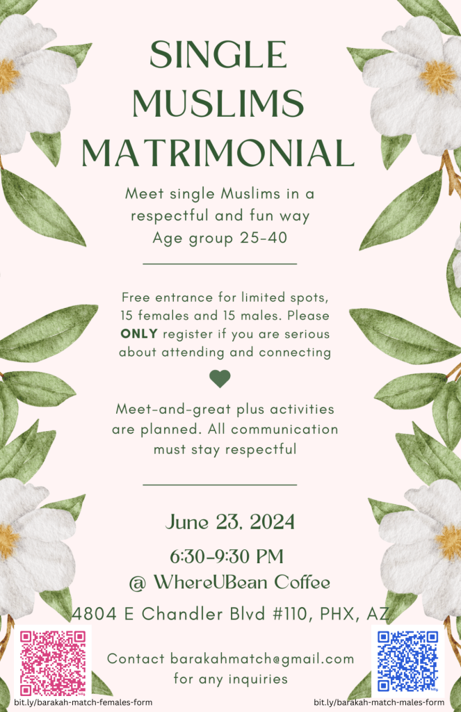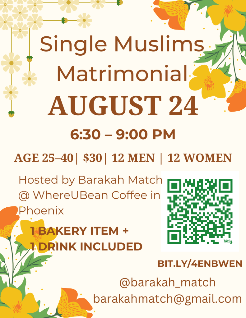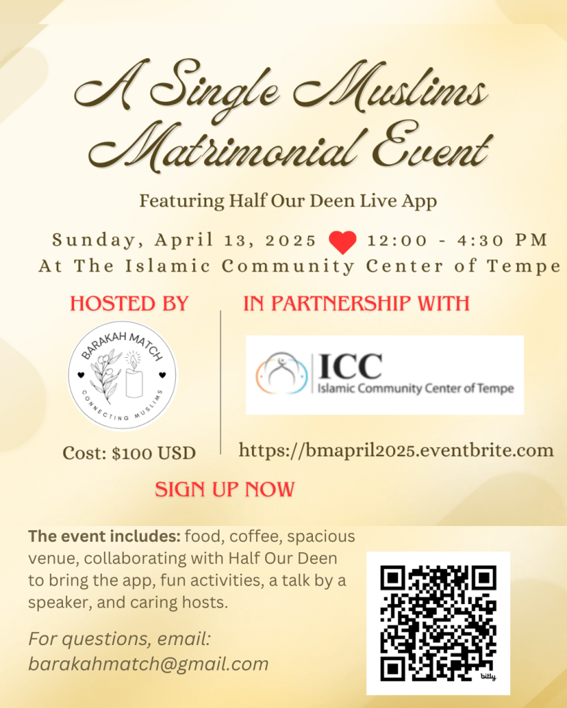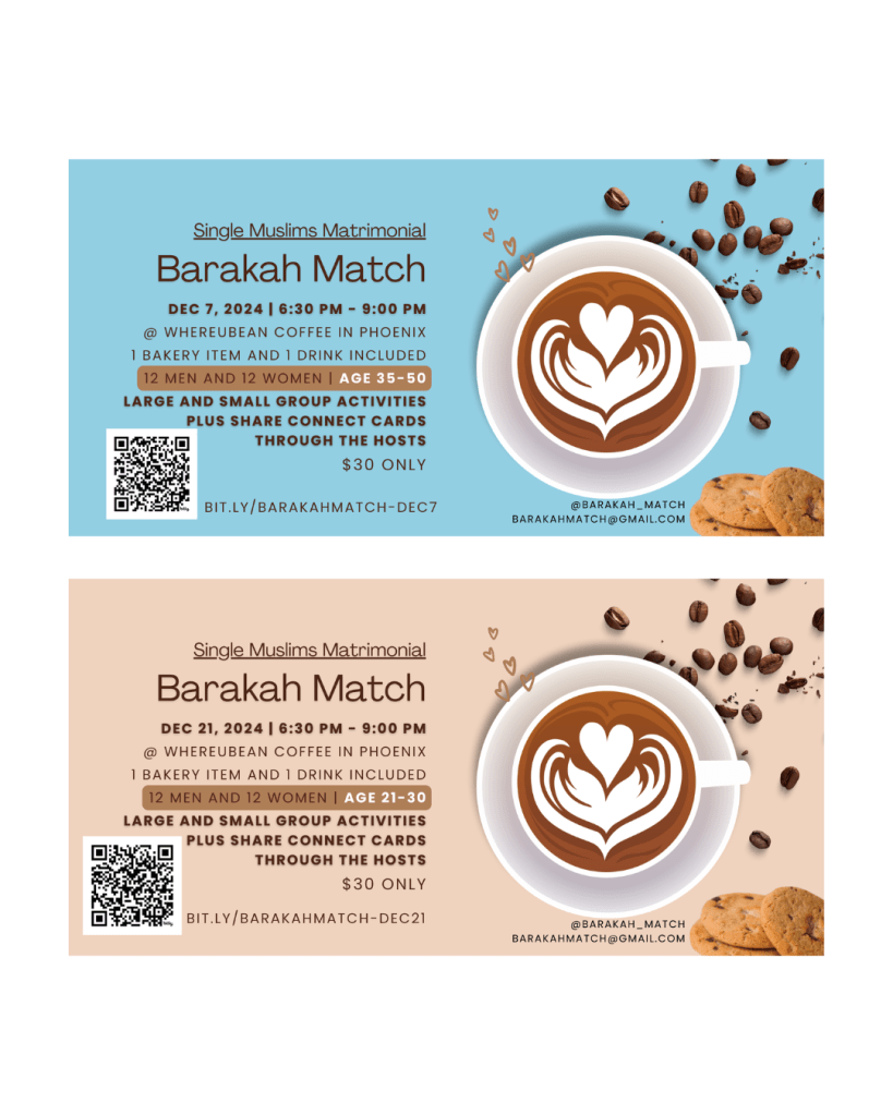 Dive into our Past Events page and see the beautiful connections that have flourished right here in Arizona’s Muslim community! Let the joyful moments of those who found their lifelong partners inspire your own journey. Your Barakah Match is just around the corner, In sha Allah!